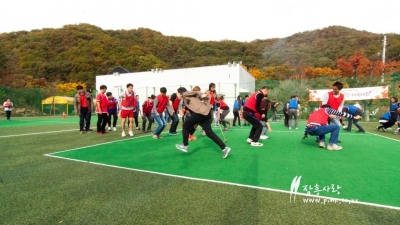 인조잔디 깔린 중운동장에서 명랑운동회를 하는 모습